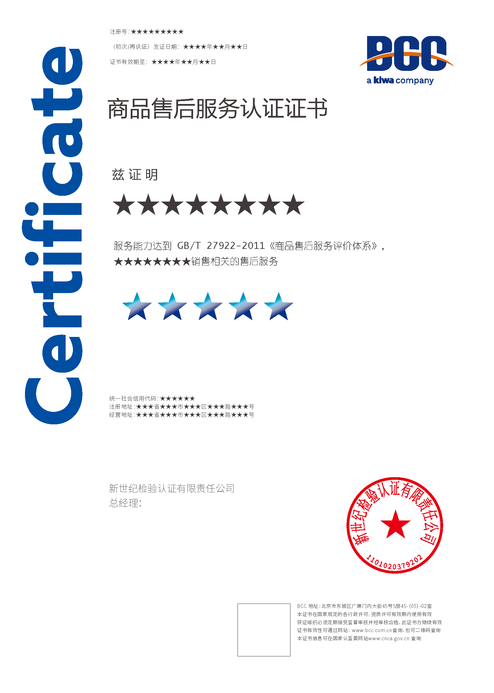 商品售后服務認證證書