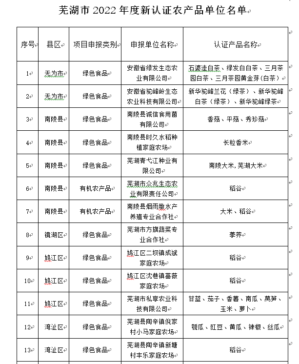 根據(jù)《蕪湖市農(nóng)業(yè)農(nóng)村局 蕪湖市財政局關(guān)于做好2022年省財政農(nóng)業(yè)高質(zhì)量發(fā)展(“兩強一增”行動)項目實施工作的通知》(市農(nóng)計財〔2022〕60號)要求,經(jīng)縣(市)區(qū)農(nóng)業(yè)農(nóng)村部門申報,市農(nóng)業(yè)農(nóng)村局審核,擬對蕪湖市2022年度新認(rèn)證綠色食品、有機農(nóng)產(chǎn)品、地理標(biāo)志農(nóng)產(chǎn)品的29家單位進行公示。如下圖: