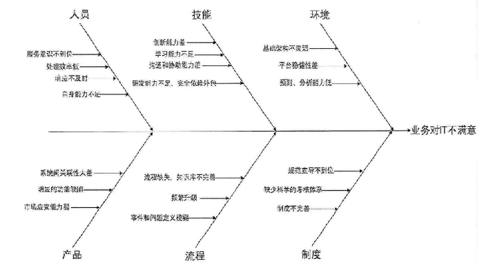 業(yè)務(wù)對IT服務(wù)不滿意的因素可以歸結(jié)在人、物、軟能力、外部環(huán)境、流程和規(guī)則制度六個方面。在對各種影響因素進(jìn)行分析后,進(jìn)一步尋找服務(wù)不滿的真正原因,繪制出魚骨圖。