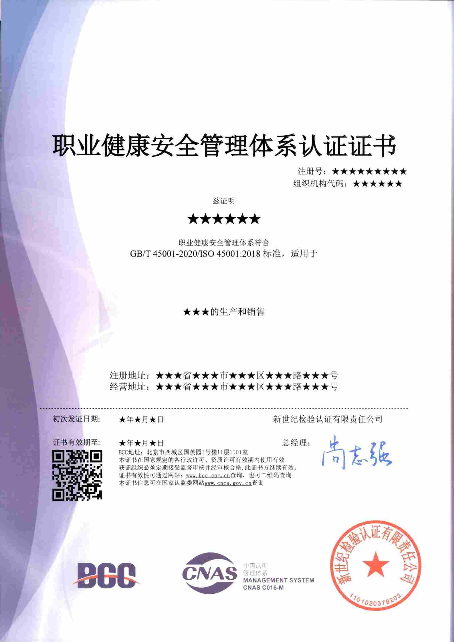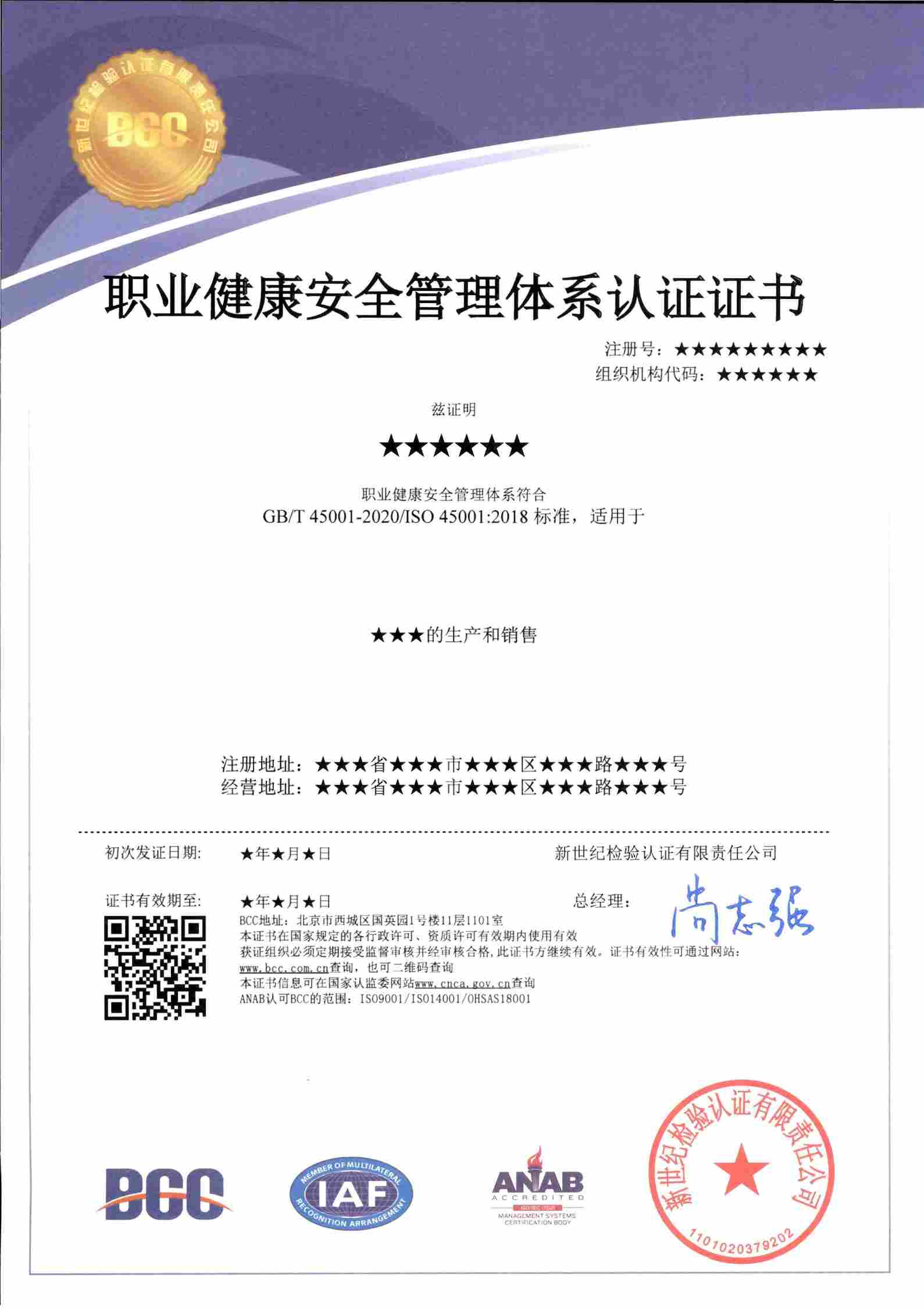 職業(yè)健康安全管理證書(ANAB) 職業(yè)健康安全管理證書(CNAS)